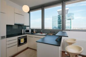 Welcome to Mischek Tower, a modern and stylish apartment with an amazing view from a very high floor and huge terrace, perfectly suited for long-term stays in Vienna. Our spacious apartment offers a comfortable and convenient base for professionals working at the nearby United Nations headquarters, Vienna International Centre, and the bustling Danube City. With stunning views, great furnishings, and all the amenities you need, you’ll find it easy to settle in and focus on what matters most.