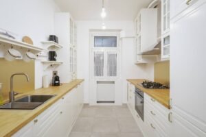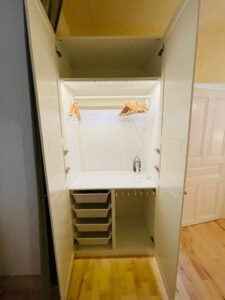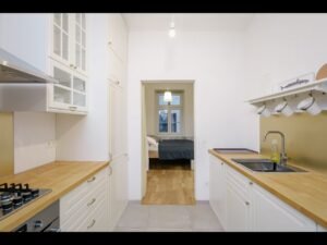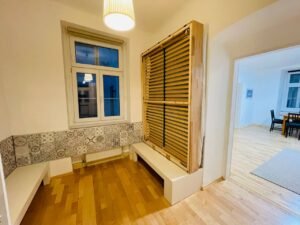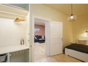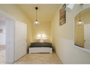- 1 bedroom between living room and kitchen with a king-size bed (that can be used also as an office (the bed can be flexibly converted as it can be stored against the wall, as described in the photos). So this also can serve as an excellent guest-room.